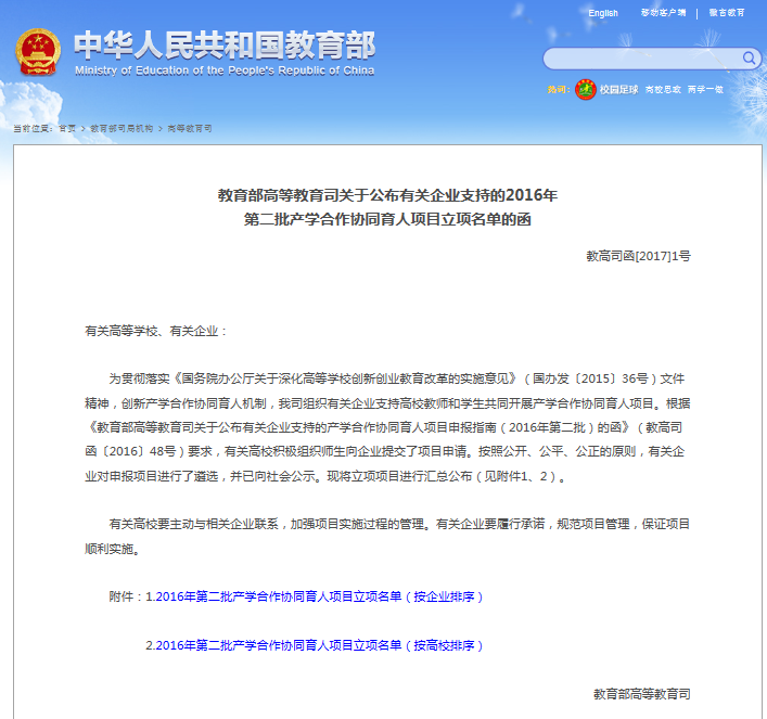 教育部网站链接:http://www.moe.edu.cn/s78/A08/A08_gggs/A08_sjhj/201701/t20170113_294777.html日前,教育部高等教育司公布了有关企业支持的2016年第二批产学合作协同育人项目立项名单(教高司函[2017]1...