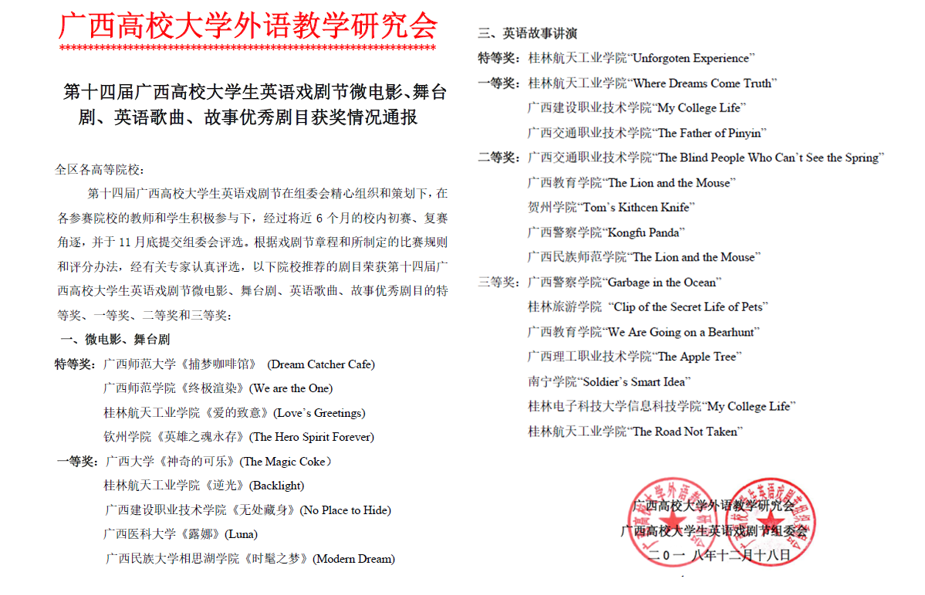 日前,从广西高校大学外语教学研究会获悉,在第十四届广西高校大学生英语戏剧节上,由开云选送的两部微电影作品《爱的致意》以及《逆光》分别荣获微电影组的特等奖以及一等奖。另外开云选送的学生作品《难忘的经...