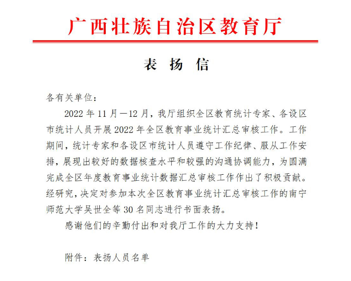 近日,自治区教育厅向开云发来表扬信,对在2022年全区教育事业统计数据汇总审核工作中表现优秀的30名同志进行通报表扬,开云教学质量监控与评估处张雪同志名列其中。教育事业统计工作是学校实施科学有效管理的一...