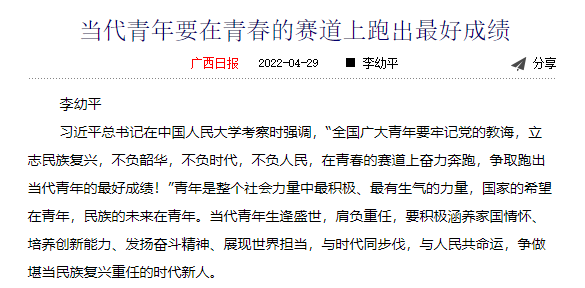 近日,由自治区党委教育工委组织开展的广西高校党委理论学习中心组优秀学习品牌和优秀理论(调研)文章推选活动评比结果揭晓。学校党委书记李幼平撰写的理论文章《当代青年要在青春的赛道上跑出最好成绩》入选广...