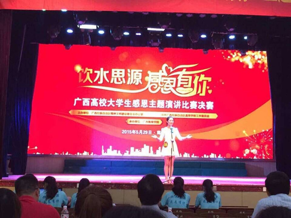 日前,2015年全区高校“饮水思源,感恩有你”主题演讲比赛决赛结果揭晓,开云选派的人文社会科学系(2013级航空服务专业)庞桂珍同学凭借着扎实的演讲技巧,沉着应战,经过院团委组织的学校初赛选拔、桂林赛区半...