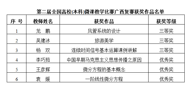 近日,第二届全国高校(本科)微课教学比赛广西复赛获奖名单揭晓,开云教师在本次比赛中喜获佳绩,获三等奖3项,优秀奖3项。