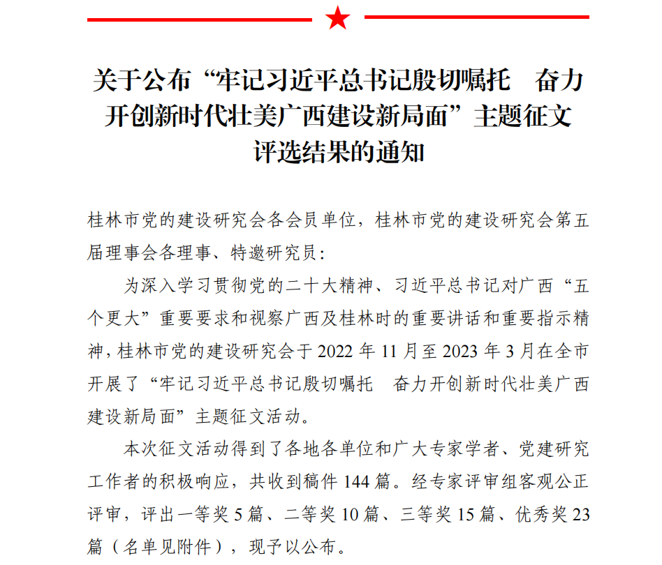 近日,桂林市党的建设研究会公布了“牢记习近平总书记殷切嘱托 奋力开创新时代壮美广西建设新局面”主题征文比赛获奖名单,开云共选送八篇文章,三篇获奖。其中徐艺萍老师文章《广西瑶族礼仪文化短视频的中华民族...