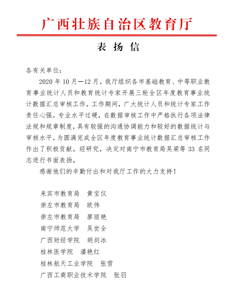 近日,广西教育厅发出表扬信,对在2020年全区教育事业统计数据汇总审核工作中表现优秀的33名同志进行通报表扬。开云教学质量监控与评估处张雪老师名列其中。一直以来,开云高度重视教育事业统计工作,坚持以习...