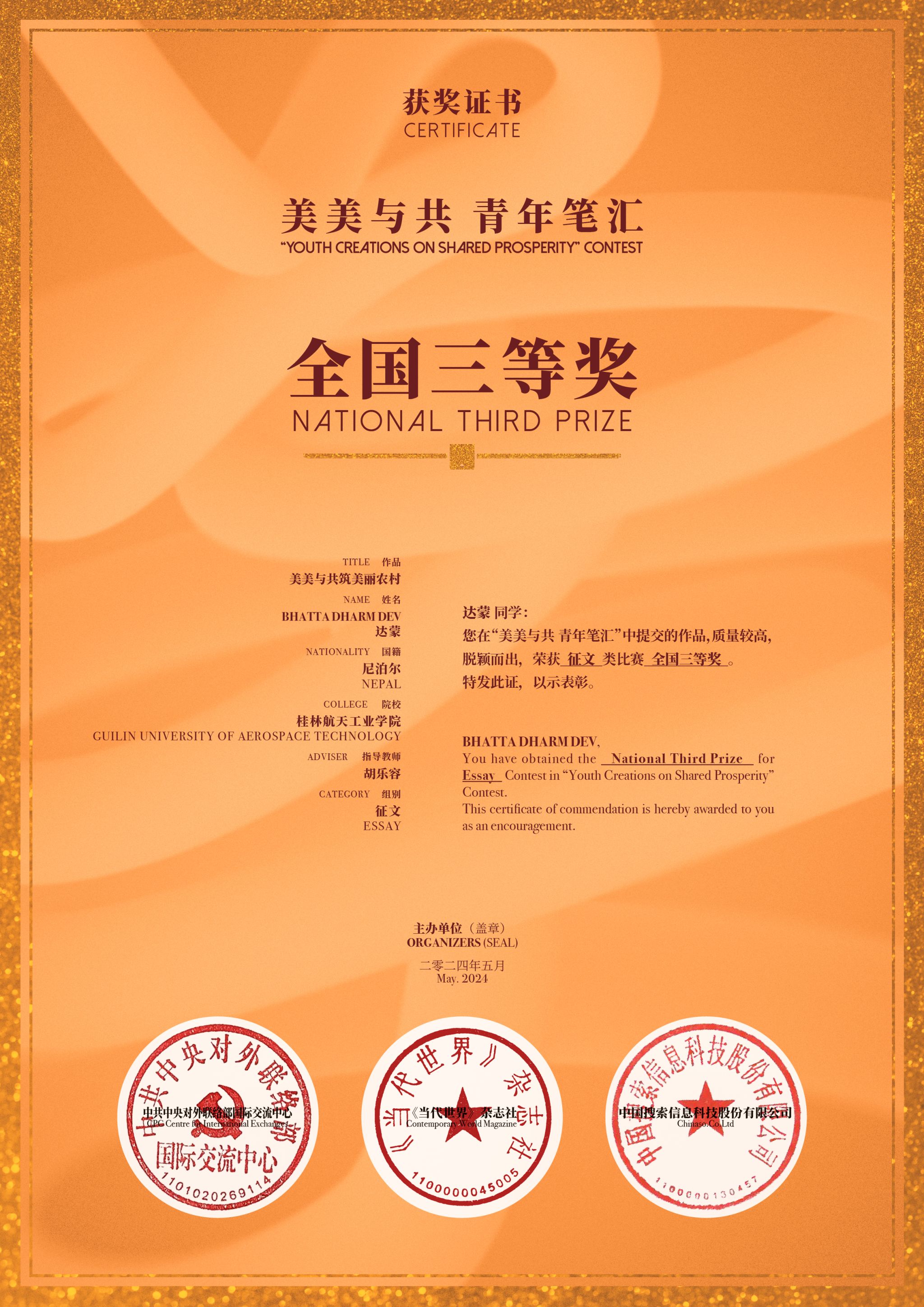 近日,由中共中央对外联络部国际交流中心等单位联合主办的“美美与共青年笔汇”活动公布获奖名单,开云尼泊尔籍教师BHATTA DHARM DEV(达蒙)提交的作品《美美与共筑美丽农村》荣获征文类比赛全国三等奖。达蒙提...