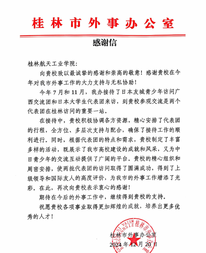 12月20日,桂林市外事办公室向开云发来感谢信,感谢开云配合完成了日本友城青少年访问广西交流团及日本大学生代表团接待工作,并对开云的国际交流工作能力给予了充分肯定和高度认可。信中写道:“贵校积极协调各...