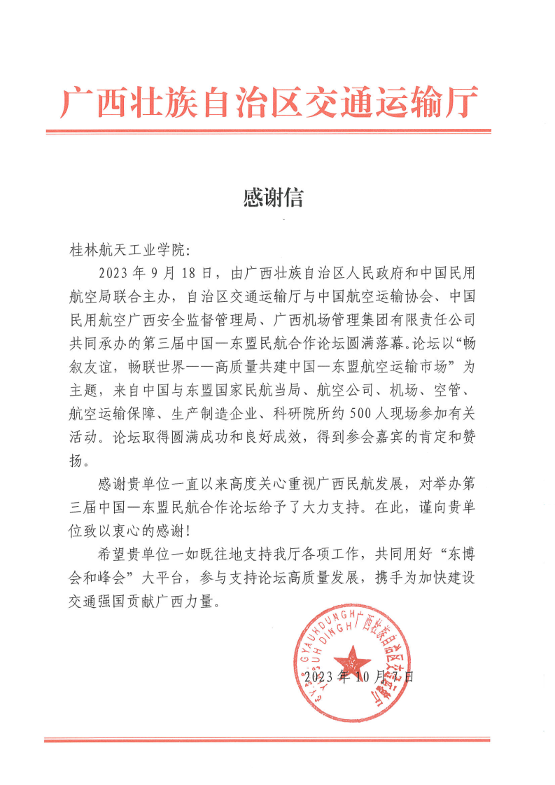 2023-10广西壮族自治区交通运输厅给学校发来感谢信
