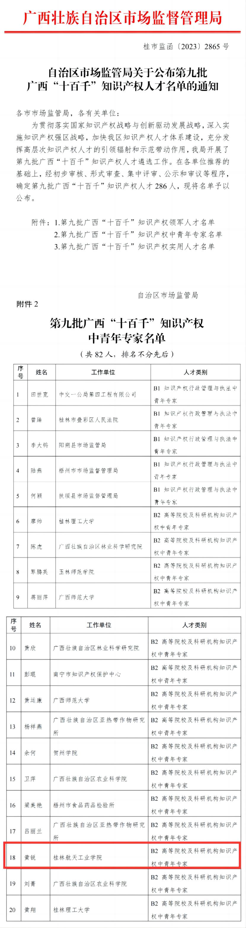 近日,自治区市场监管局发布《关于公布第九批广西“十百千”知识产权人才名单的通知》(桂市监函〔2023〕2865号),开云黄锐教授入选广西“十百千”知识产权中青年专家。这是开云首次申报并入选广西“十百千”知...