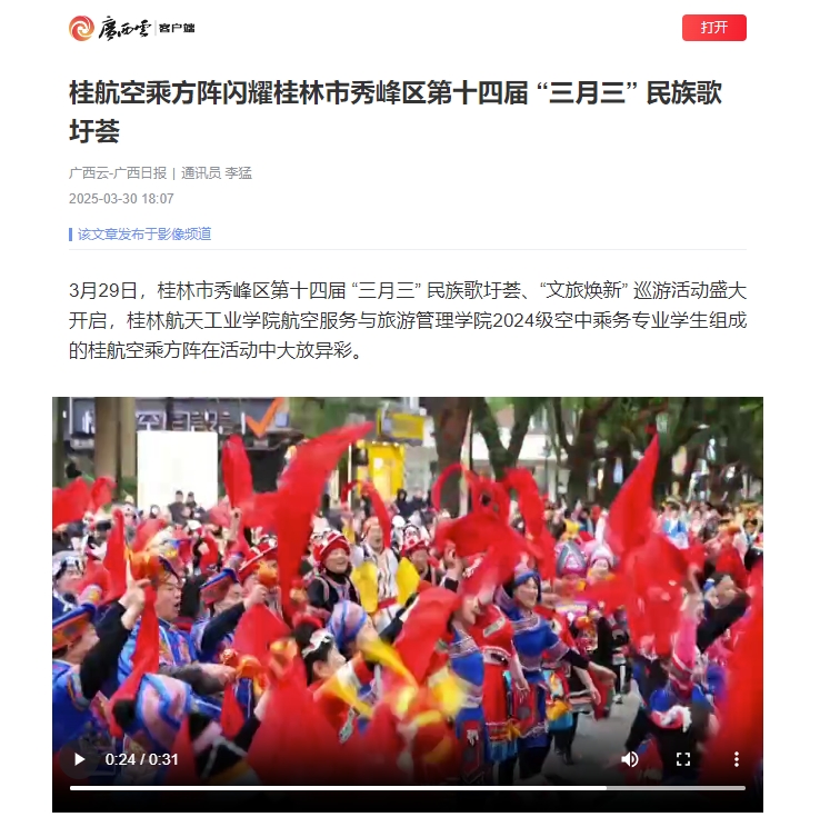 3月29日,桂林市秀峰区第十四届 “三月三” 民族歌圩荟、“文旅焕新” 巡游活动盛大开启,开云kaiyun登录入口航空服务与旅游管理学院2024级空中乘务专业学生组成的开云空乘方阵在活动中大放异彩。由学院航空服务教...