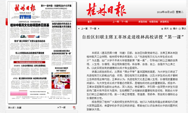 2014-09《桂林日报》:自治区妇联主席王革冰走进桂林高校讲授“第一课”