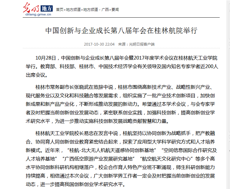 2017-10【光明网】中国创新与企业成长第八届年会在桂林航院举行