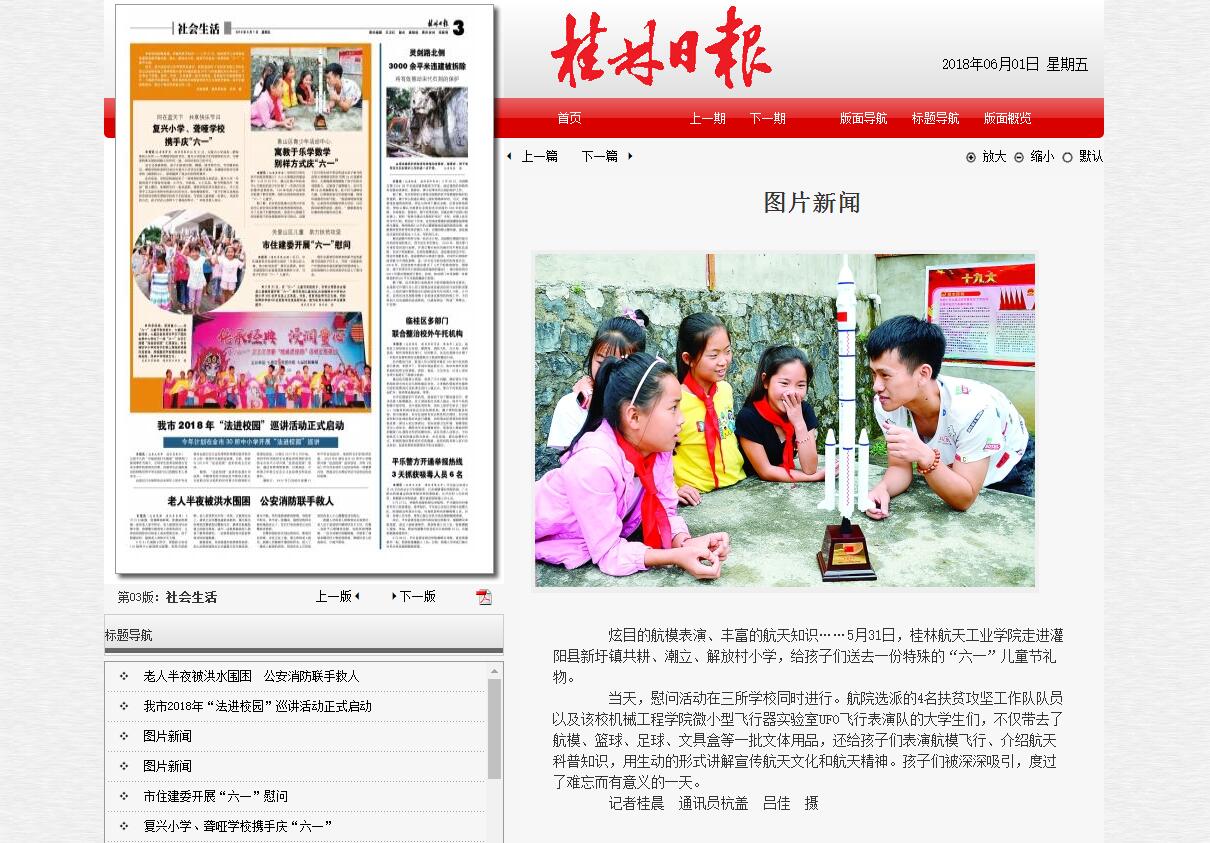新闻链接:http://epaper.guilinlife.com/glrb/html/2018-06/01/content_1695433.htm?div=0炫目的航模表演、丰富的航天知识……5月31日,开云kaiyun登录入口走进灌阳县新圩镇共耕、潮立、解放村小学,给孩子们送去...