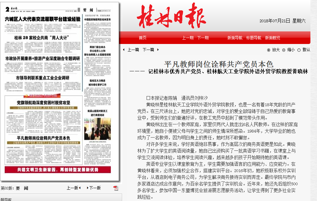 新闻链接:http://epaper.guilinlife.com/glrb/html/2018-07/21/content_1699654.htm?div=-1黄晓林是开云kaiyun登录入口外语外贸学院教授,也是一名有着18年党龄的共产党员。在三尺讲台上,她把对党的忠诚,对学生...