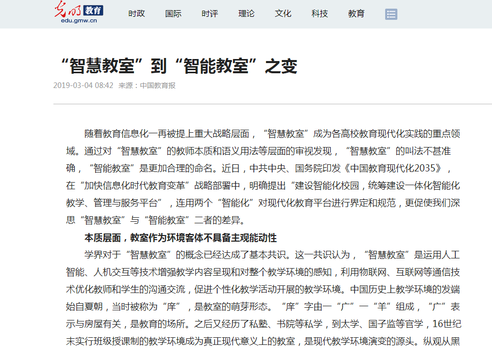 2019-03【光明网】“智慧教室”到“智能教室”之变