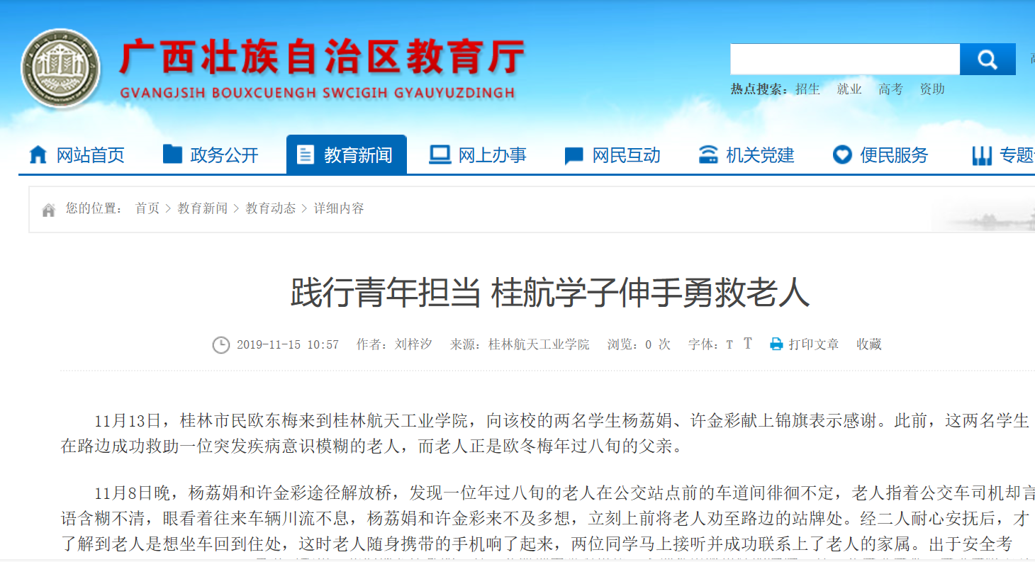 2019-11【自治区教育厅】践行青年担当 开云学子伸手勇救老人