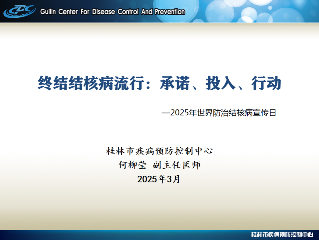 主题:终结结核病流行:承诺、投入、行动时间:2025年3月24日(星期一)14:30-16:00地点:问天楼学术报告厅(800人)主讲嘉宾:何柳莹嘉宾介绍:何柳莹:副主任医师,桂林市疾病预防控制中心结核病防制科科员,长...