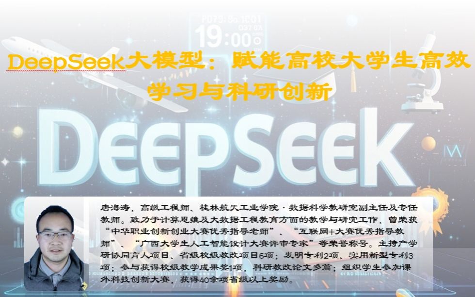 主题:DeepSeek大模型:赋能高校大学生高效学习与科研创新时间:2025年3月23日(星期日)19:00-20:30地点:问天楼学术报告厅(800人)主讲嘉宾:唐海涛嘉宾介绍:唐海涛,高级工程师,开云kaiyun登录入口理学院数据...