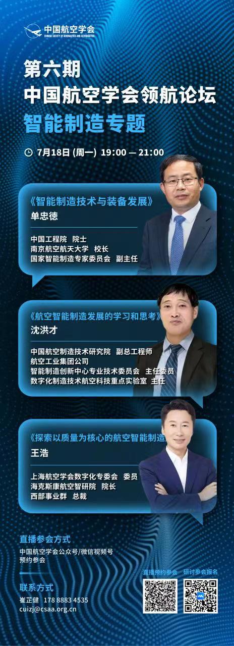 第六期中国航空学会领航论坛-智能制造专题主讲:单忠德、沈洪才、王浩时间:7月18日(周一)19:00-21:00参会方式:中国航空学会公众号/微信视频号预约参