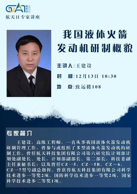 主题:我国液体火箭发动机研制概貌时间:2023年12月13日 星期三 10:30——12:00地点:北校区致远楼108主讲嘉宾:王建设,高级工程师,一直从事我国液体火箭发动机研制管理工作,曾参与或组织了多型液体火箭发动机...