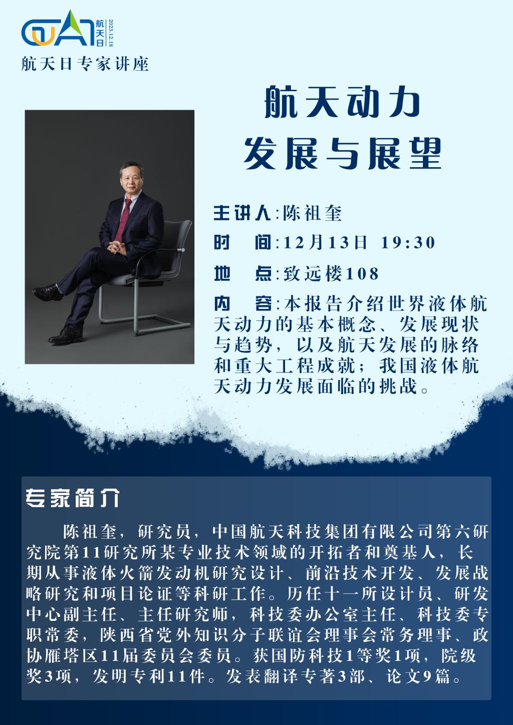 主题:航天动力发展与展望时间:2023年12月13日 星期三 19:30——21:00地点:北校区致远楼108主讲嘉宾:陈祖奎,研究员,中国航天科技集团有限公司第六研究院第11研究所某专业技术领域的开拓者和奠基人,长期从事...