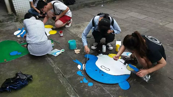 为丰富校园文化生活,激发学生的想象力和创造激情,并增强师生安全意识,近日,传媒与艺术设计系在校园内开展了以航天、环保为主题的添彩校园井盖涂鸦活动。