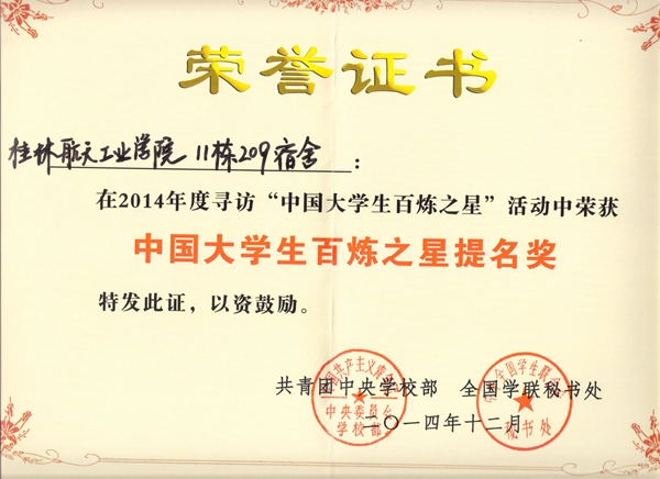 近日,由团中央学校部、全国学联秘书处组织开展的2014年度寻访“中国大学生百炼之星”活动结果揭晓,开云北校区11栋209宿舍 (汽车工程系2014级汽车服务工程专业)荣获2014年度“中国大学生百炼之星”提名奖。