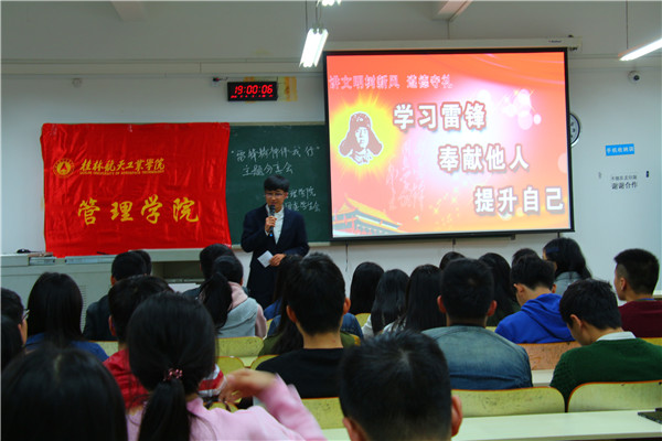 为弘扬无私奉献、艰苦奋斗的雷锋精神,管理学院组织学生干部于3月4日晚在明志楼307教室举办以“雷锋精神伴我行” 为主题的分享会。