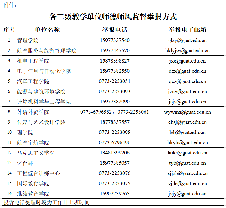 附件:各二级教学单位师德师风监督举报方式