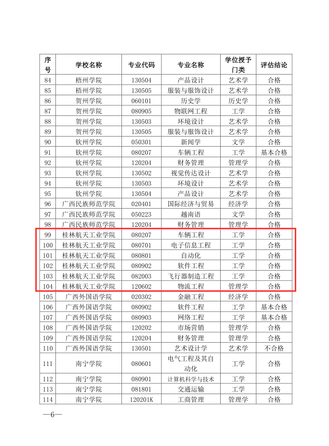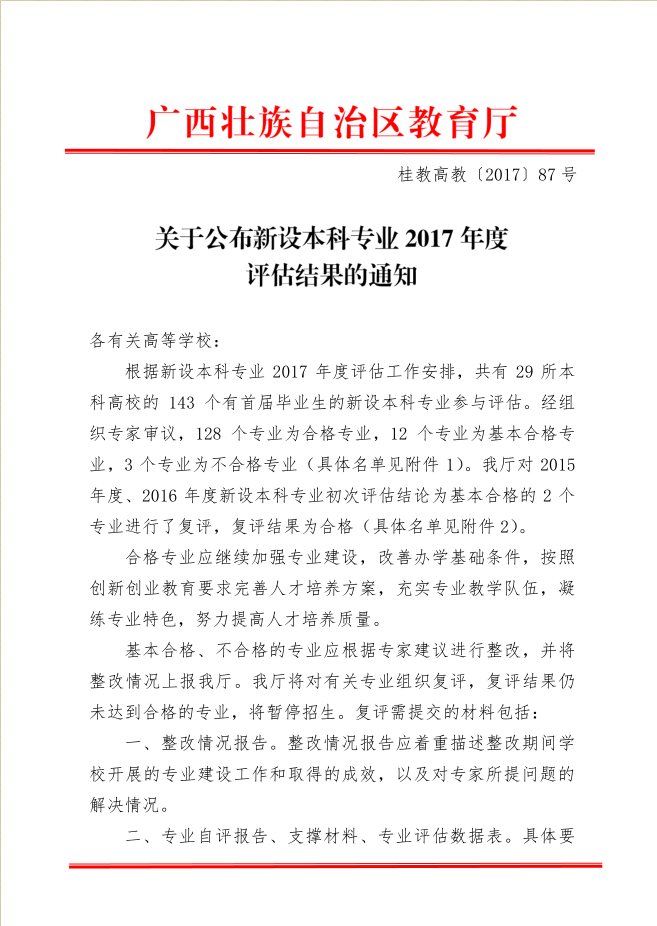 根据桂教高教〔2017〕87号《关于公布新设本科专业2017年度评估结果的通知》,2017年开云6个新设本科专业(物流工程、飞行器制造工程、电子信息工程、自动化、车辆工程、软件工程)全部合格。