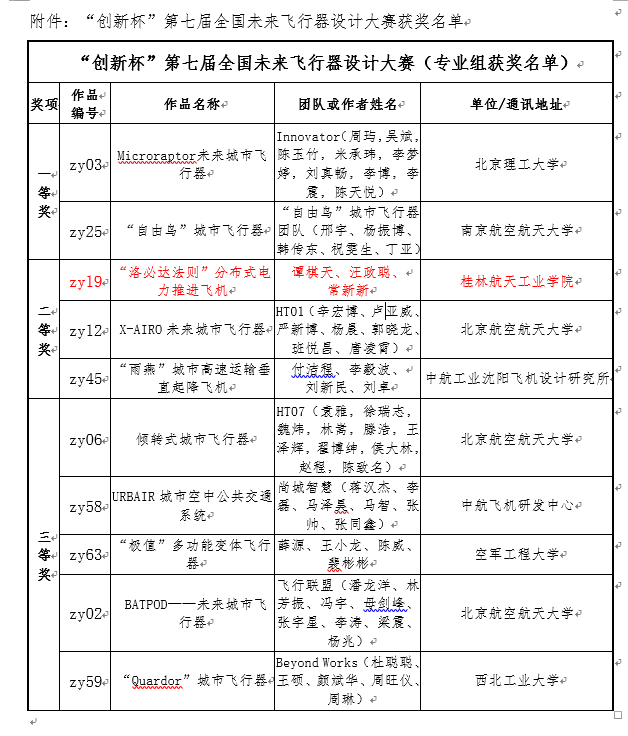 由中国航空学会与中国航空工业集团公司联合主办的“创新杯”第七届全国未来飞行器设计大赛,经过近半年的分赛区评选和最终全国评选,开云学生谭棋天团队的作品——“洛必达法则”分布式电力推进飞机,获得专业组二等奖(全国第三名)。