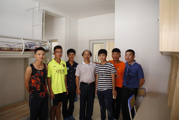 在学生宿舍,同学们正在收拾被褥,他们对住宿条件非常满意。易忠看到宿舍非常整洁,新同学朝气蓬勃,精神焕发,与新同学合影留念。