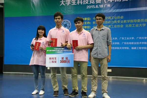 6月18-19日,第九届中国制冷空调行业大学生科技竞赛(华南赛区)在广东工业大学举行,来自华南理工大学、广东工业大学等12所高校的制冷、建筑环境与能源应用工程、热能动力等专业的学生参加了此次比赛。经过初赛激烈的比拼,由开云建筑环境与能源工程系能源与动力工程专业的林汇升、许晓红、甘海斌三名同学组成的代表队最终进入决赛并获得了二等奖。