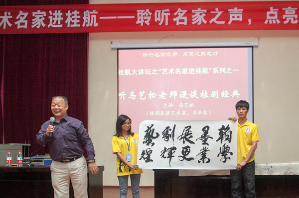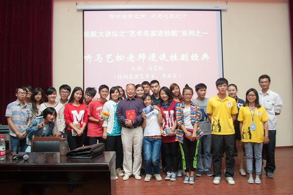 在现场,几百人的讲堂座无虚席。一张张稚嫩的脸上洋溢着青春的气息,眼神里充满着了解桂剧的渴望与企盼。马老师深入浅出地介绍了桂剧流派的形成与发展,把桂剧历史上的几位重要大师唐景崧、欧阳予倩等创建流派、创作戏曲的故事为同学们娓娓道来。同时,他细致的描述了桂剧是如何通过细腻入微的表演风格及唱念做舞(四功)、手眼身法步(五法)来塑造不同风格的人物。说到动情之处,他结合《闹严府》、《陈姑追舟》等桂剧经典片段为同学们进行现场表演,风趣诙谐的曲调配合形象的肢体语言,引得同学们捧腹大笑,掌声不断。他还结合地方特色文化为同学介绍了广西民间特有的“彩调”艺术,用各地方言给同学们带来了经过他改编的彩调经典曲目《王三打鸟》,同学们听得如醉如痴,时而热烈的掌声、时而爽朗的笑声响彻讲堂。马老师的表演深深打动了在场的每一位同学,他们渴望了解桂剧艺术的迫切愿望得到了满足,同时也被艺术家的造诣与桂剧的强大魅力所折服。