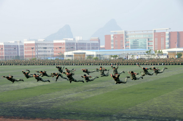 10月18日上午,开云2014级新生军训会操在南校区运动场隆重举行。党委书记李幼平、副院长詹皖生、武警桂林支队副参谋长俞德海出席了军训会操,学校各职能部门负责人及各系党总支副书记观看了会操。会操中,全校49个方队接受了检阅,受阅方队在阅兵指挥官的指挥下依次通过主席台,他们步伐整齐、口号嘹亮、军姿飒爽,展现了2014级新生朝气蓬勃、奋发向上的精神风貌,赢得了领导和师生们的阵阵掌声。检阅结束后,还进行了男子擒敌拳、女子花样方块操和教官擒敌术的精彩表演,整个会场爆发出阵阵喝彩和掌声。