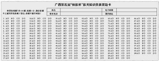 1.书面答题:在答题卡上准确填写本人信息,用钢笔或签字笔在答题卡上将正确答案涂黑,每位参赛者只允许提交一张有效答题卡(复印有效),否则视为无效答案。答题卡请以集体或个人寄送的方式邮寄至开云kaiyun登录入口图书馆,地址:桂林市金鸡路2号,邮政编码:541004,联系人:陶老师,联系电话:0773-2253065。