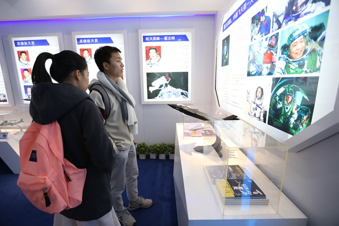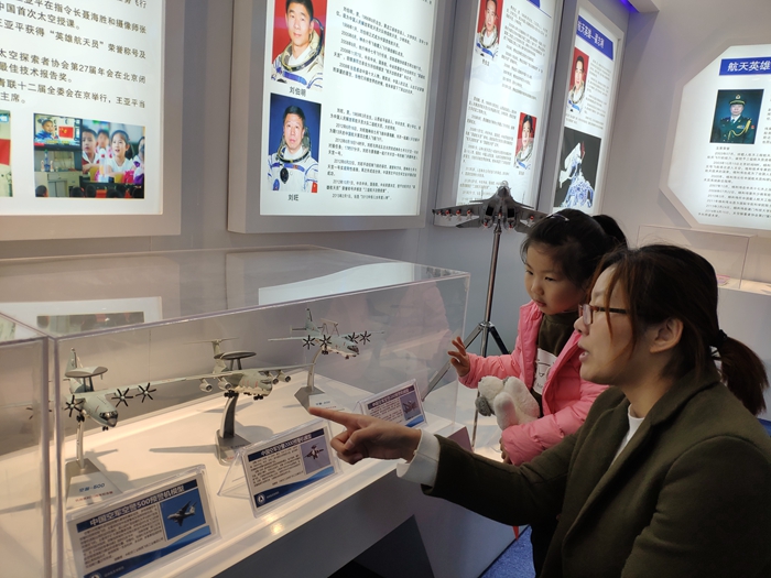 在航天博物馆展厅,展出的导弹、火箭、卫星等中国航天的标志性飞行器模型展品,吸引了观众们的目光。其中最为瞩目的是一架由中国载人航天办公司主任、“中国飞天第一人”杨利伟将军和中国工程院院士戚发轫、刘永才等联合签名的飞机模型展品,前来参观的师生和市民在航天英雄人物事迹、各类航天器模型、中国航天发展史图文等,前来参观的同学络绎不绝。2018级车辆工程专业的黄山同学告诉记者,他看到中国航天的发展感到特别骄傲。2018级汽车服务工程的韦力同学表示,参观完航天博物馆并了解到我国航天历史感到十分激动,更加坚定了自己努力奋斗的决心。