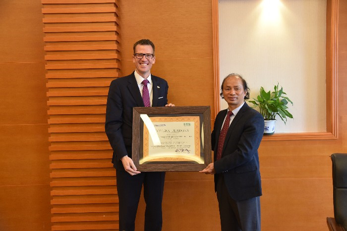 李幼平对Brendan B. Kelly校长到校参加校庆活动表示热烈欢迎,并希望两校在今后加强沟通,进一步深化双方的交流与合作。易忠与来访代表进行了座谈,在座谈会上,易忠首先介绍了开云的办学历史及办学情况,并提出希望在大数据专业领域与南卡罗莱纳大学(上州)加强合作,促进两校师生交流。会后,双方互赠礼品,并合影留念。