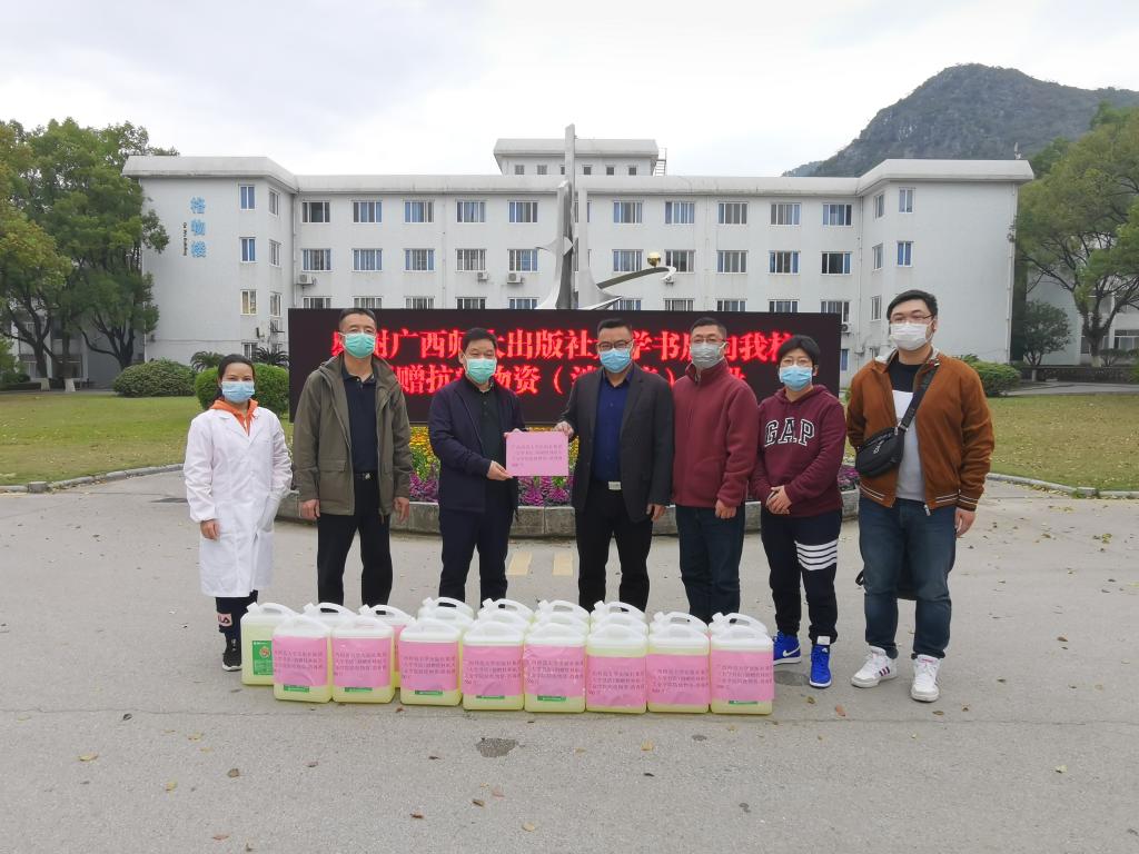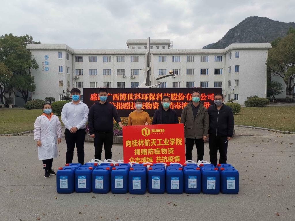 2月24日下午,广西博世科环保科技股份有限公司、广西师大出版社集团大学书店、桂林全新领跑汽车有限公司等单位负责人专程向学校分别捐赠了1000斤含氯消毒原液、500斤含氯消毒原液、10箱乙醇消毒液及500个医用口罩。学校副校长孙山林及办公室、后勤处、卫生所等单位负责人出席交流。