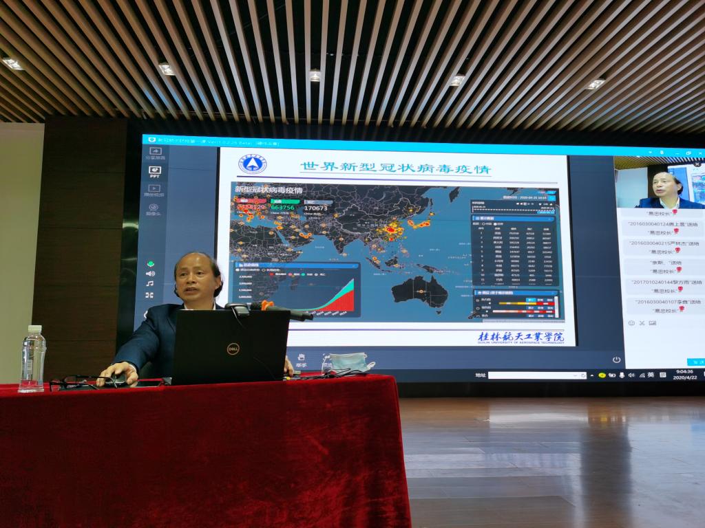 培训会上,易忠校长首先对返校同学表示欢迎,他说,一场突如其来的新冠肺炎疫情让同学们度过了一个特殊的假期,学校开学的时间一再推迟,在党中央的正确领导和全国人民的共同努力下,目前,我国的新冠肺炎疫情得到了有效的遏制,广西区内高校在陆续开学,我们学校也迎来了第一批返校毕业年级学生。学生返校后的安全防护是目前学校的防控重点,因此,新冠肺炎防护知识的科普显得尤为重要。易忠在讲座中从最新的疫情动态入手,从传染病基础知识、开学返校后的防护指引、学生心理健康指引三个方面对新型冠状病毒相关防控知识进行解读。
