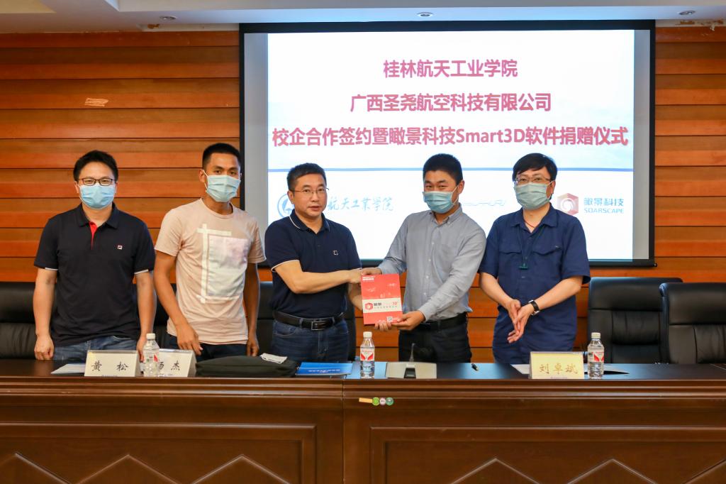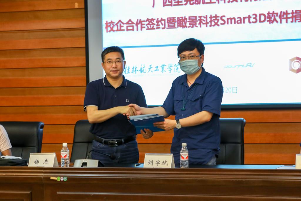杨杰与刘卓斌分别代表校企双方进行了合作签约,并为校外实践基地揭牌。瞰景科技发展(上海)有限公司向学校赠送Smart3D三维实景建维系统软件。