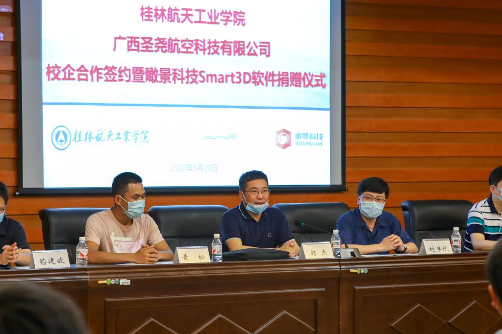 刘卓斌对广西圣尧航空科技有限公司进行了简要介绍。他表示,公司将加强与学校的合作,支持科研从高校走到企业,为航测无人机、人工智能、大数据方面创造更灿烂的未来,希望学校为公司培养更多的人才。