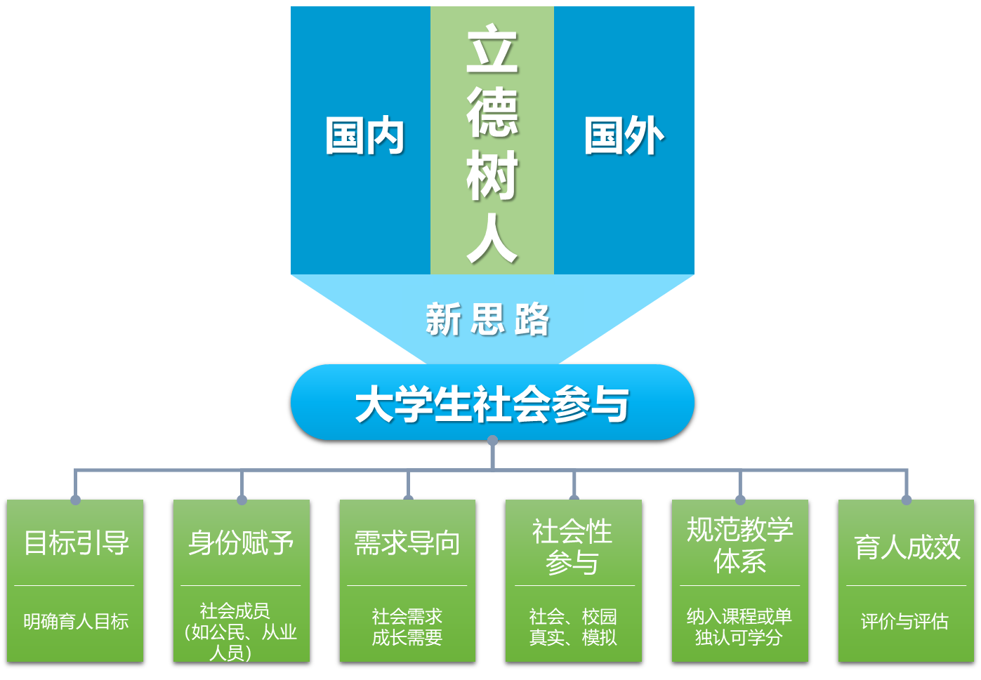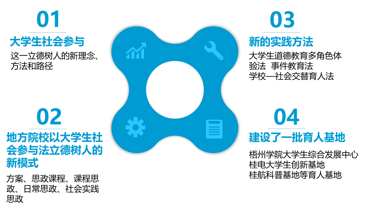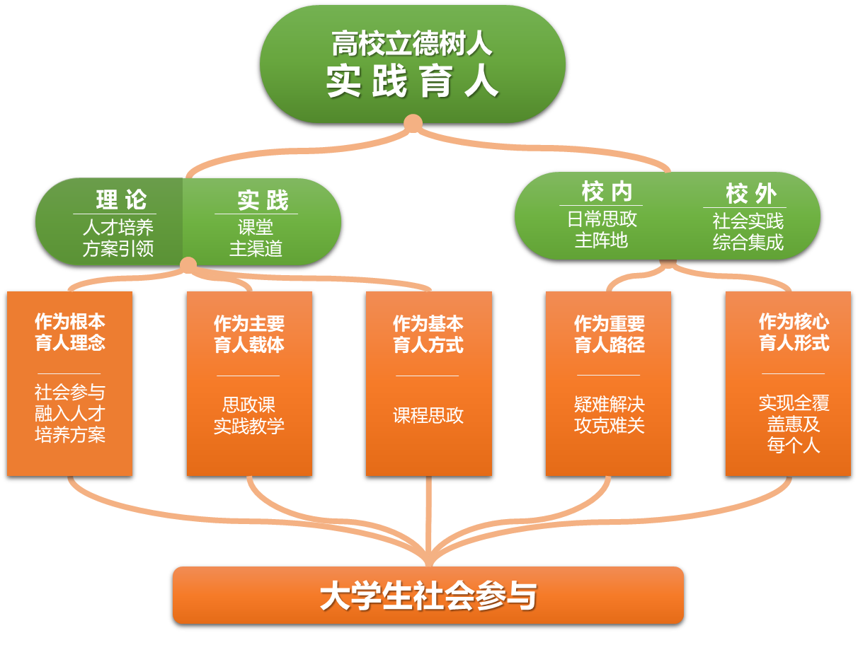 它的核心内容是:用大学生社会参与法的理念整体设计和系统优化人才培养方案,夯实高校立德树人的根本基础;以大学生社会参与作为思政课实践教学的主要载体,促进其常态化、制度化和全覆盖;将大学生社会参与作为课程思政的基本方法,助推其可操作、可融合并提高其效率;把大学生社会参与作为日常思政工作的重要途径,拓宽学生成长成才疑难问题解决的思路;使大学生社会参与作为社会实践的主要形式,帮助其常态化、全覆盖,实现普惠。