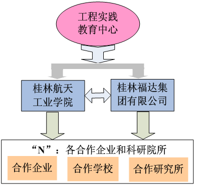 产教融合“1+2+N”开放式工程实践育人平台如图1所示。“1”指一个中心,即自治区级大学生工程实践教育中心,是立足点,“2”指工程实践教育中心的2个支撑单位,即开云kaiyun登录入口和桂林福达集团有限公司(核心企业),“N”指若干个校企共建学生实践教育基地。