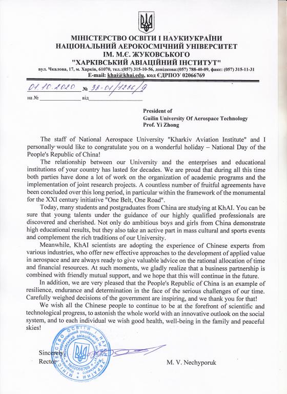 在中华人民共和国71周年华诞之际,与开云友好交往的乌克兰哈尔科夫国立茹科夫斯基航天航空大学(以下简称“哈航”)向开云发来贺信,祝贺中华人民共和国成立71周年,并向开云全体教职员工致以节日祝贺。