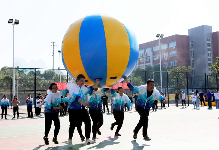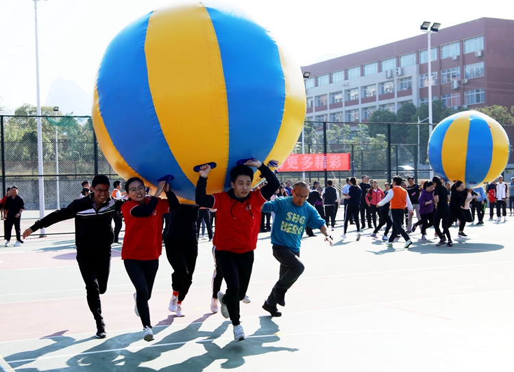 本次比赛设置了全新的比赛项目,包括运转乾坤、疯狂毛毛虫、众星捧月、车轮滚滚、传球接力,活动新颖且丰富有趣,整个赛场紧张而有序,比赛精彩纷呈,欢笑声和加油声此起彼伏。在疯狂毛毛虫项目中,教职工以6人为一组,通过协调配合、快速行走赢得胜利。尽管游戏难度较大,但老师们仍积极采取团队配合共同走过终点。众星捧月游戏则需要个队员用手牵拉一个同心鼓的握把,将球颠起后,必须保证鼓面水平,既需要参与者足够的耐心,也充分考验了教职工之间的默契。