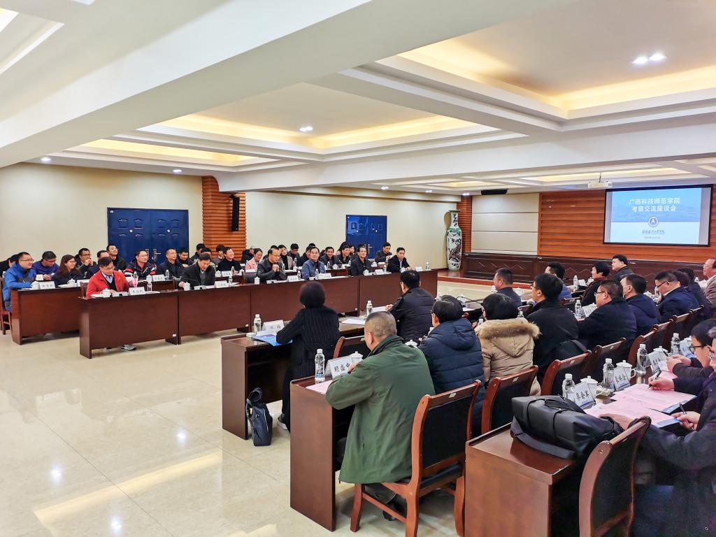 12月7日,广西科技师范学院党委书记张鹏、校长杨杰率队,党委副书记吴江萍、陈翔、副校长蓝海、梁梅等校领导和相关部门单位负责人来校考察交流。学校党委书记李幼平、党委副书记刘迎春、罗延忠、副校长罗国湘、孙山林、纪委书记韦冠武和相关部门单位负责人热情接待了来访客人,并组织召开了座谈交流会。