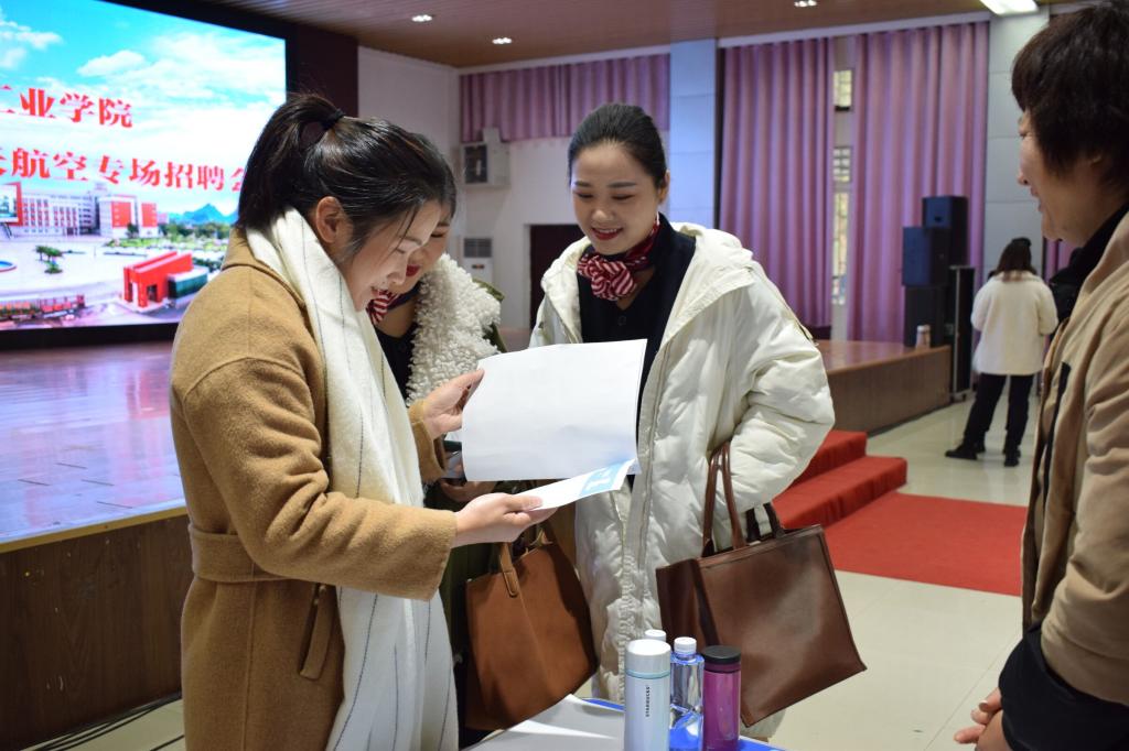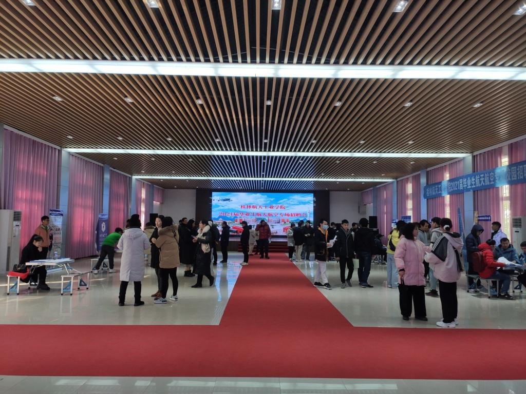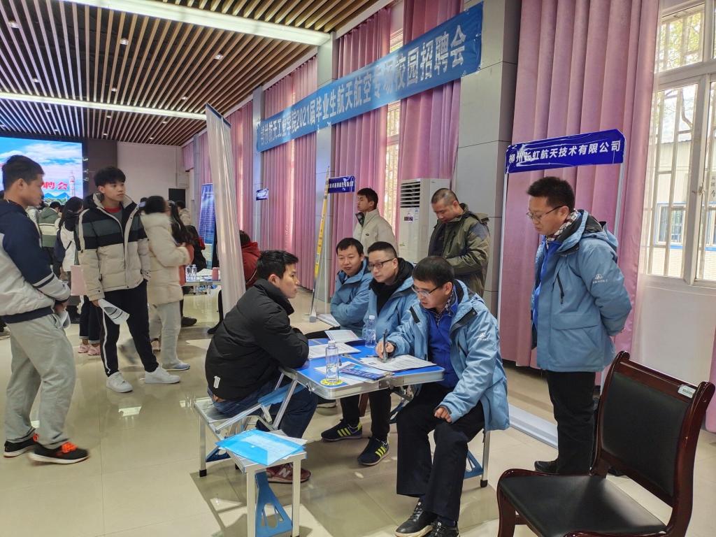 招聘会现场气氛热烈,柳州长虹航天技术有限公司、桂林航天电子有限公司、广西展卓通用航空有限公司、北京昱翔航空服务有限公司、广西怡飞航空服务有限公司等航天航空单位应邀参会。