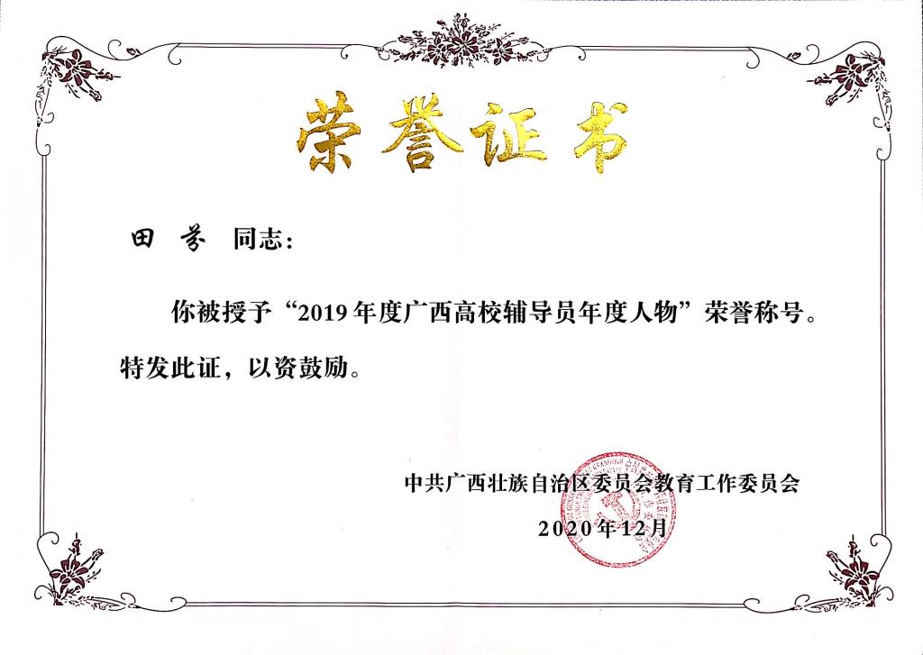 近日,由中共广西壮族自治区委员会教育工作委员会主办的“2019年度广西高校辅导员年度人物”评选活动结果揭晓,开云电子信息与自动化学院辅导员田芬荣获“2019年度广西高校辅导员年度人物”荣誉称号。