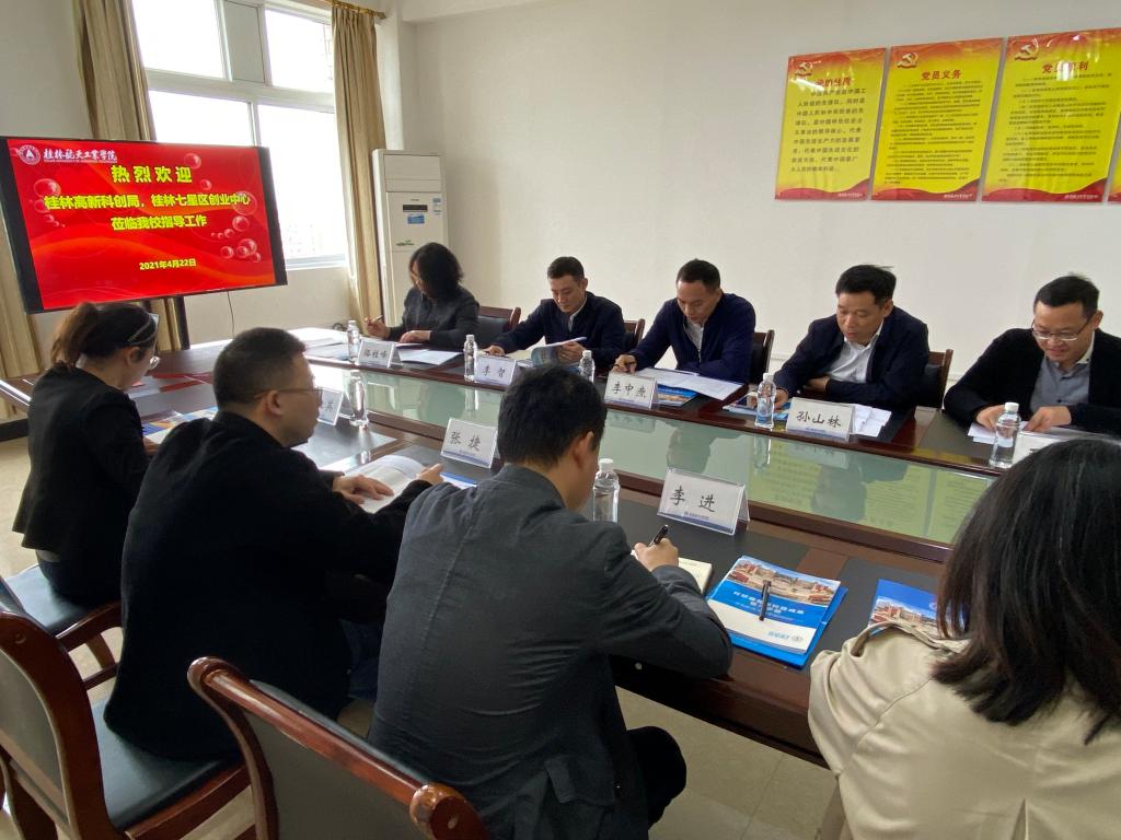 4月22日,桂林市高新科创局局长李进、桂林科技创业服务中心副主任张捷一行6人来开云调研。学校副校长孙山林出席会议,科技处、校团委、双创学院相关负责人参加座谈会。