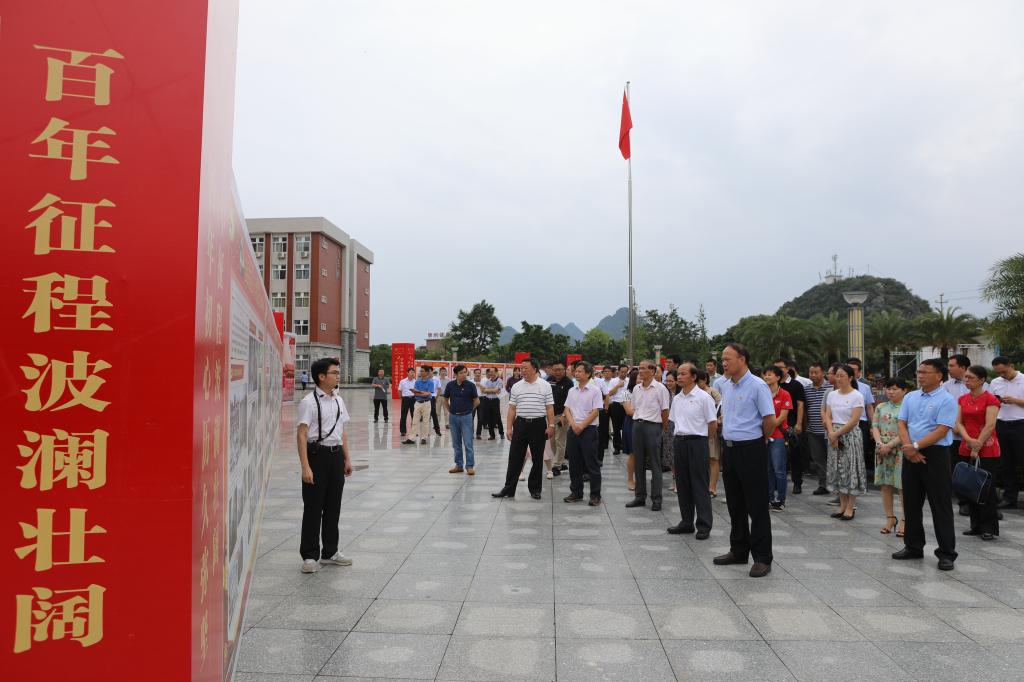 为庆祝中国共产党百年华诞,7月1日,学校党委书记李幼平带队前往南校区钱学森广场,参观了“百年荣光”主题党史图片展。党委副书记、校长易忠和在家校领导,中层干部共同参观,并在“永远跟党走”的签名墙上签名。马克思主义学院教师吉铠东博士担任展览讲解员。